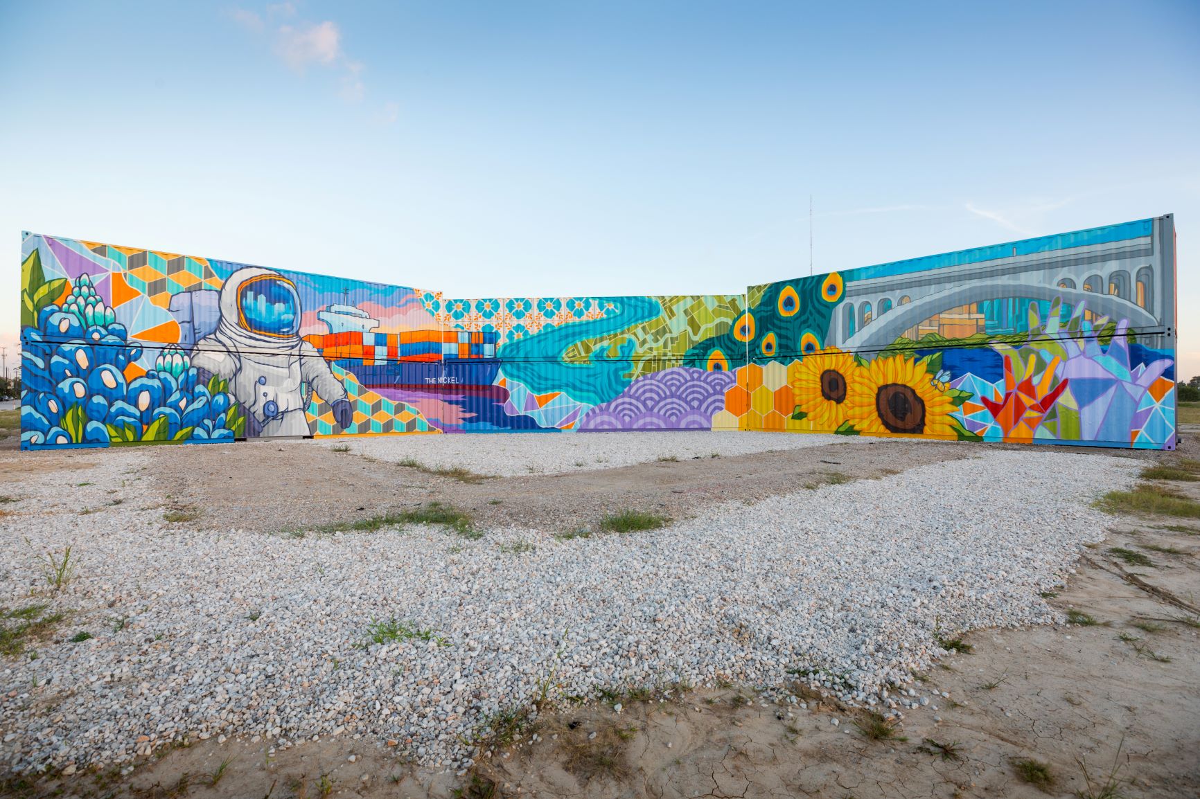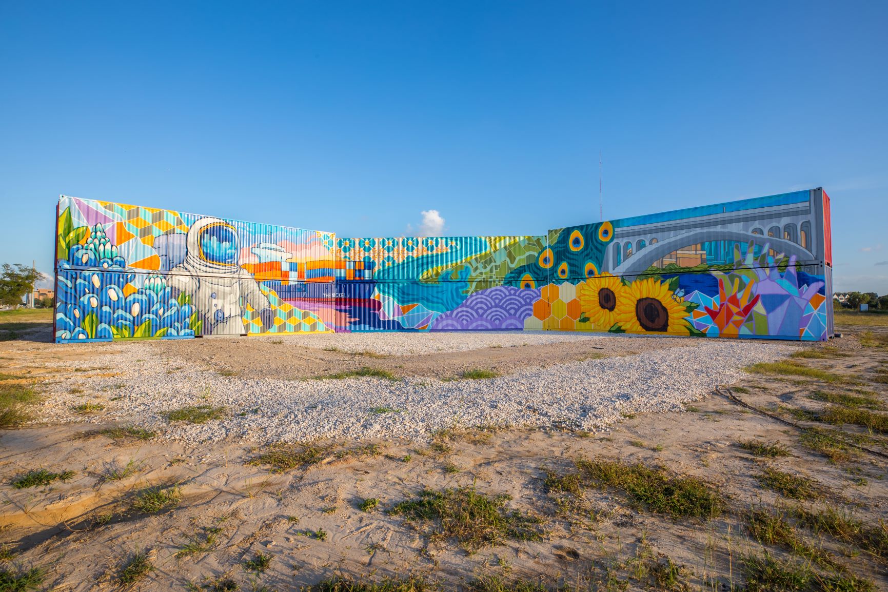 Inspired by the surrounding Historic Fifth Ward and East End neighborhoods, the East River mural represents the power of the bayou and its ability to connect the city’s diverse communities. Mosaic tiles, beehives promoting sustainability and wellness, and an astronaut nodding to Houston’s strong ties with NASA are all included in the intricately detailed piece. Following a months-long design process, Maldonado painted the mural on-site at East River over a two-week period, using six shipping containers as his canvas.
